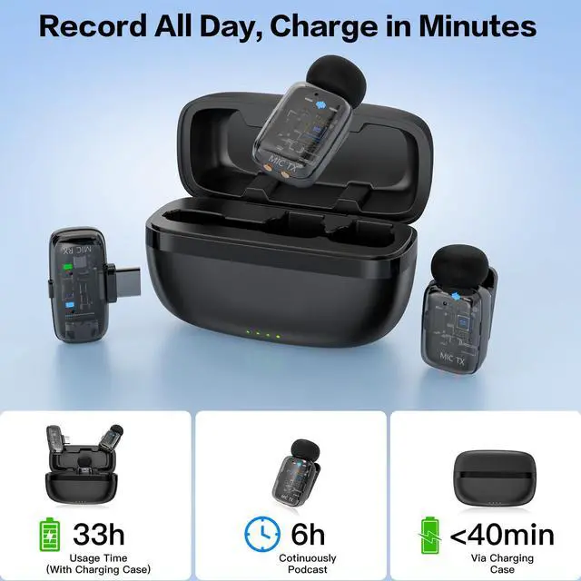 The 700 mAh charging case powers both mics for up to 33 hours in total. A quick 40-minute charge provides around 6 hours of continuous use. LED lights show remaining power at a glance.