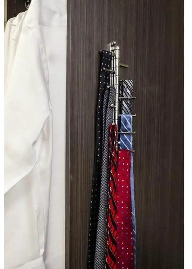 Store 12 ties, scarves, or belts on a small footprint on our 12-hook cascading tie organizer. Its narrow vertical design works great on the face of a closet casing or for tight spaces like behind a door. 12 free-swing hooks allow you to easily put on or pull off items from the rack. Lip on the end of the hook keeps items from sliding off. Mounts quickly with just two screws. Satin Nickel finish.
