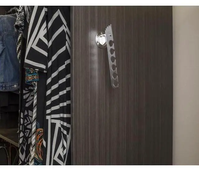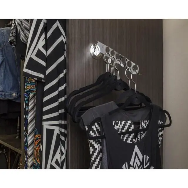 Our heavy-duty laundry valet offers convenient and stylish hanging storage for your garments. The valet features an adjustable design that locks into four different angled positions and folds down when not in use. Six slotted holes can hold a multitude of hangers at a time, and wire neck hangers can easily be moved around. This versatile hanger is great for hanging garments to air dry in a laundry room, hold coats in a closet or mudroom, or create additional hanging space in a closet. Satin Nickel finish.