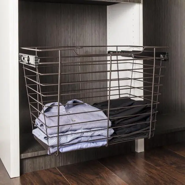 Store your closet essentials in our heavy-duty wire pullout basket. Full-extension slides and sloped front allow for easy access to all your items. Baskets easily remove from slides for ultimate portability. Closet wire baskets are a cost-effective alternative to a 5-piece drawer. Basket measures 16" deep, 29" wide, 11" height. Width is measured from the second wire and the slides add an additional inch. For 30" wide opening. Includes Black ball bearing slides with hooks to hold basket. Dark Bronze finish.