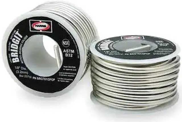 California Proposition 65: This product contains a chemical known to the State of California to cause birth defects or other reproductive harm. Solder Wire, Form Solid Wire, Material Composition 0.05 - 0.15 Percent Silver, 0.05 -2 Percent Nickel, 2.5 - 3.5 Percent Copper, 4.5 - 5.5 Percent Antimony, Tin Remainder, Wire Diameter 0.125 in, Weight 8 oz, Melting Temperature (Minimum) 460 Degrees F, Melting Temperature (Maximum) 630 Degrees F, Solder Series Bridgit, For Joining Brass to Brass, Brass to Copper, Copper to Copper, Application Used Where Lead Bearing Solders are Prohibited, Container Type Spool, Flux Requirement Flux Required. This item has been restricted from sale in the following state (s): []