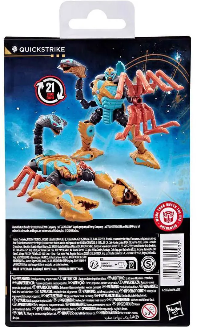 The Quickstrike figure converts from robot to scorpion mode in 21 steps, offering an engaging transformation experience for fans and collectors. In scorpion mode, the bendable tail becomes a snake-head arm in robot form, while movable claws add even more playability and display options.