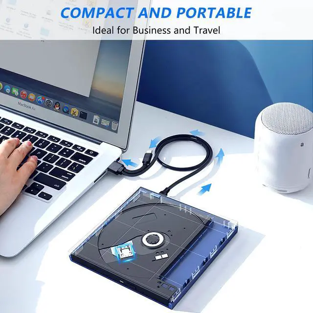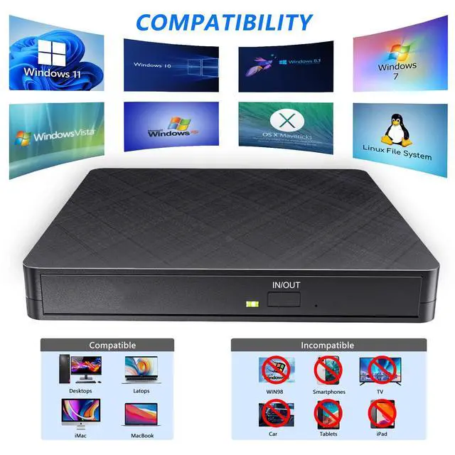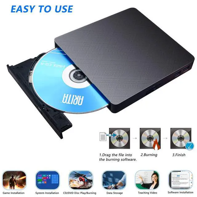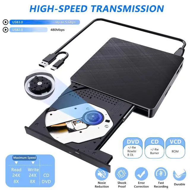 Noise reduction, shockproof, anti-interference and strong error correction ability. With the CD DVD burner, you can enjoy DVD/CD movies without delay, and convert music and movies to CD or DVD. It is the perfect companion for all computers without a built-in drive.