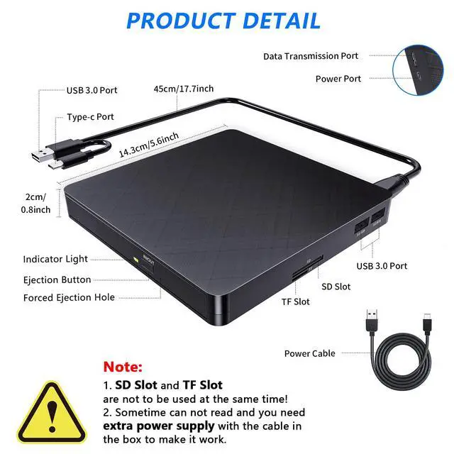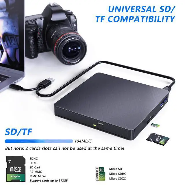The external CD DVD drive has an independent SD/TF card slot, a data transfer port and 2 USB 3.0 ports. It can transfer photos and videos directly from the SD/TF card to the computer.