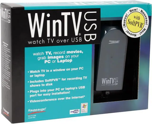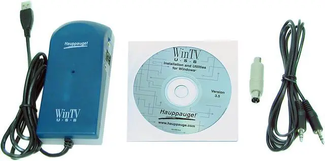 | Package Contents | WinTV-USB with 125 channel cable-ready TV tuner (mono audio) Audio cable for connection to sound card Composite/S-Video adapter WinTV CD-ROM includes: WinTV application for TV watching and image capture SoftPVR for making MPEG movie WinTV-Scheduler, for scheduling your TV recordings WinTV-Editor, for editing your MPEG recordings Installation and reference manual |