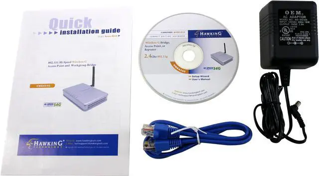 | Package Contents | HWBA54G Quick Installation Guide Resource Disk RJ45 Cable Power Adapter |
