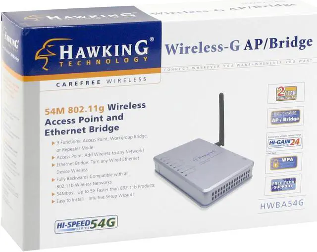 | Features | One 54M Wireless-G AP/Bridge One CD, includes Drivers, Setup Wizard and Manual Easy to follows Quick Installation Guide |