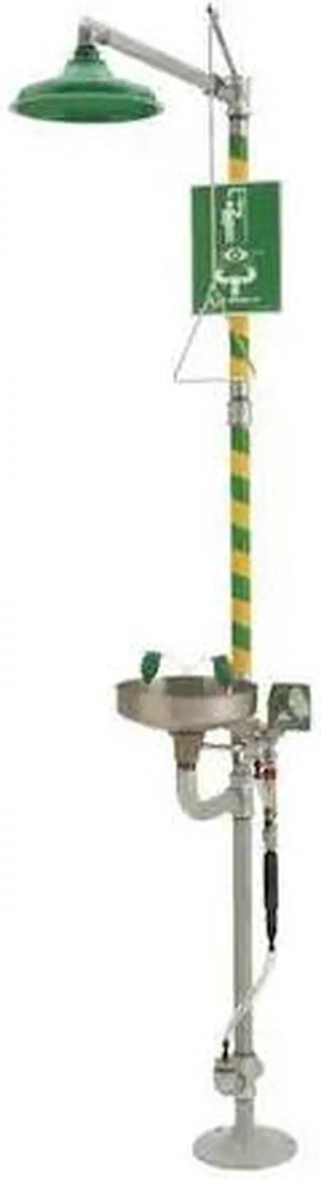 Shower with Eyewash, Barrier Free No, Bowl Style Uncovered, Coverage Eyes, Eyewash Bowl Material Stainless Steel, Hazardous Location Rating Not Rated, Includes AXION (R) MSR Hydrodynamic Showerhead, Inspection Tag, Powder-Coated Cast Iron 9 in Diameter Floor Flange, Self-Adhesive High Visibility Safety Green and Bright Yellow Stripes, Universal Sign, Includes Foot Pedal No, Includes Showerhead Shroud Yes, Inlet Connection Location Top, Inlet Pipe Gender Female, Inlet Pipe Size 1 1/4 in. This item has been restricted from sale in the following state (s): []