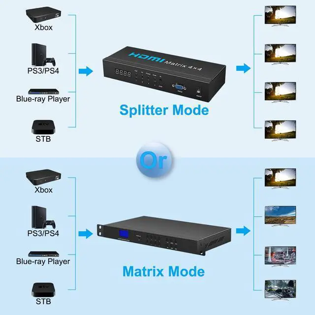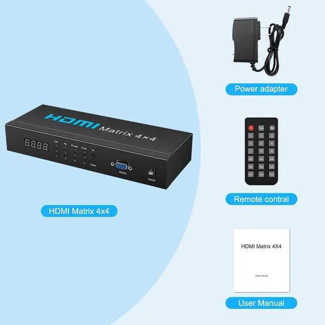 Support stroe scene and recall scene mode: this hdmi matrix switch can save/recall up to 16 modes. It can automatically restore previous matrix status after next power on. Also support OTO(one to one connection).