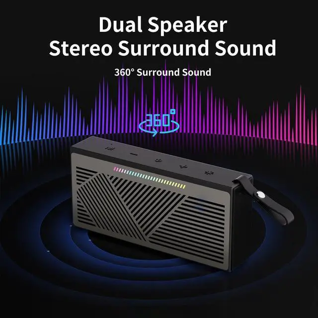 Bluetooth 5.3 and TWS PairingThe portable Bluetooth speaker features advanced Bluetooth 5.3 technology, ensuring smooth audio signal transmission and guaranteeing music playback without lag or delay. The wireless Bluetooth speaker delivers powerful sound. By connecting two Bluetooth speakers, you can achieve true wireless stereo high-definition sound quality. No matter where you are, you'll feel the music surround you from all directions, as if you were in a luxurious cinema.