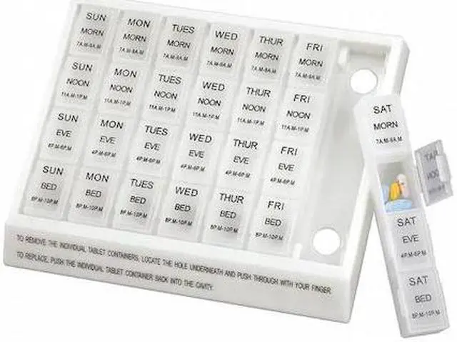 Pill Organizer, Overall Height 1 1/4 in, Overall Length 6 3/4 in, Overall Width 9 3/4 in, Product Type Pill Organizer, Compartment Legend Day and Time, Dishwasher Safe Dishwasher Safe, Number of Compartments 28, Latex Content Latex Free, Color Clear, Material Plastic