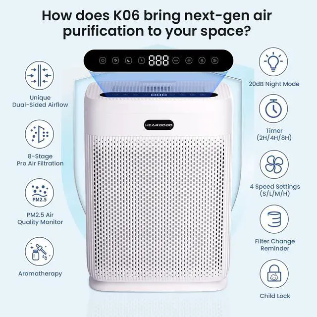 Smart Air Purifiers for Home Large Room up to 2250sq. ft, PM 2.5 Air Quality Display, H13 HEPA Air Purifier for Home Pets, Hearbobo HEPA Double-Sided 8X Filters, Auto Mode Air Cleaner with Aromatherapy