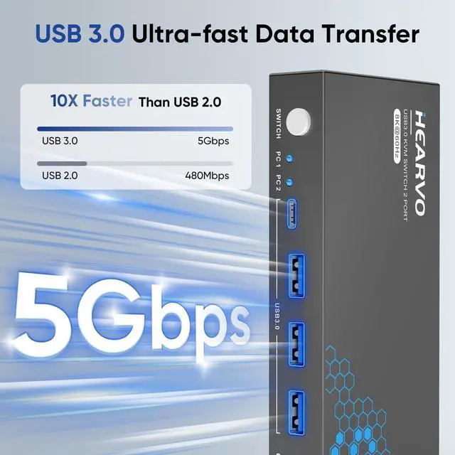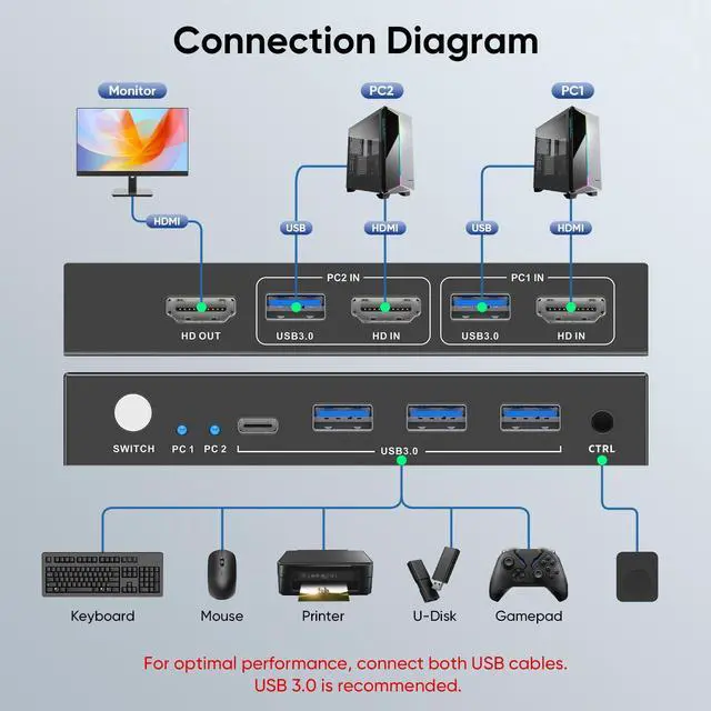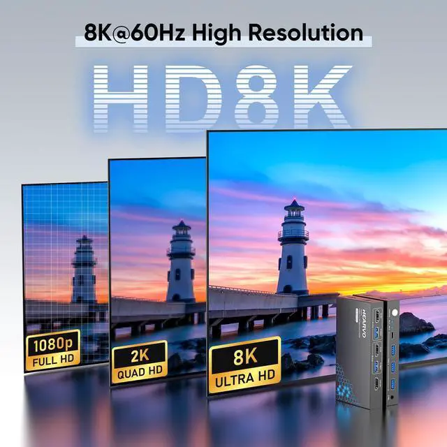 "HDMI KVM Switch 1 Monitor 2 Computers This HDMI KVM Switch with 2 HDMI ports allows control of 2 computers, enabling them to share a single monitor along with keyboard and mouse. It's a complete USB switch and HDMI switch rolled into one. This KVM Switch HDMI also supports various input devices such as PC, Laptop, PS4, etc. It is compatible with a variety of operating systems including Windows 7/8/10/11/Vista/XP, Linux, Mac, and more. Three USB 3.0 Ports KVM switches feature 3 USB 3.0 ports for ultra-fast data transfer speeds of up to 5Gbps. It allows you to seamlessly share peripherals like printers and external drives between two computers, reducing clutter and enhancing efficiency. Ideal for sharing USB devices such as keyboards, mice, scanners, printers, and flash drives, this switch automatically detects and matches connected devices. 8K Resolution & HDCP 2.3 HDMI KVM Switch supports stunning 8K resolution at 60Hz, ensuring crystal-clear and highly detailed visuals for your monitors. Additionally, it is HDCP 2.3 compliant, allowing you to seamlessly view HDCP-protected content without any interruptions. It also supports 8K@30Hz, 4K@240Hz, 2K, 3D, and 1080P, offering flexibility for various display needs. This guarantees both exceptional image quality and a smooth, secure multimedia experience. Two Ways of Switching 8K HDMI KVM Switch features two switching options: an On KVM Switches Button and a Wired Remote Switch. The Wired Remote Switch allows you to place the KVM switch HDMI in a hidden or distant location, keeping your desk tidy. Simply place the Wired Remote Switch within easy reach on your desk for quick access. With a press, you can switch between computers seamlessly, enhancing productivity and reducing clutter. Adaptive EDID & Plug and Play This USB 3.0 HDMI KVM Switch features Adaptive EDID, ensuring stable and smooth image transmission by automatically optimizing display settings. Easy to install, this KVM switch 1 Monitor 2 Computers requires no power supply or driver softwarejust plug it in and connect all the cables for seamless operation between two computers and one monitor. After-sales Service Our HDMI KVM Switch comes with 2 USB 3.0 cables and 1 wired remote switch. Please note that you need to prepare 3 HDMI 2.1 cables to connect 2 computers and 1 monitor. We offer a lifetime warranty for our products. For faster assistance, please contact us using your order number. We will provide you with a solution. Keywords: kvm switch, kvm, kvm switches, kvm switch 1 monitors 2 computers, monitor switch for 2 computers, two computers one monitor switch, hdmi kvm, kvm switch 2 computers 1 monitor, usb kvm, hdmi kvm switch, kvm switch hdmi, 2 computers one monitor switch, usb 3.0 switch, monitor switch, hdmi kvm switch 2 port, best kvm switch, kvm switch 1 monitor 2 computer, kvm monitor, usb kvm switch, 2 computers 1 monitor switch, kvm hdmi, kvm switch 2 computers, kvm switch usb."