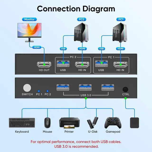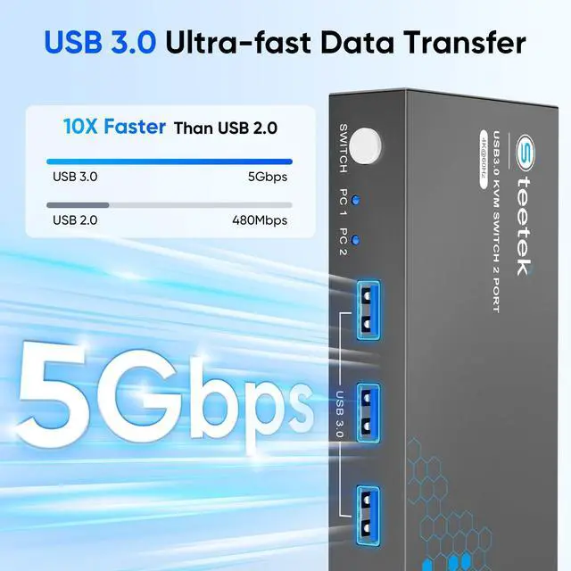 Our KVM switch features three USB 3.0 ports for ultra-fast data transfer speeds of up to 5Gbps. Seamlessly share peripherals like printers and external drives between two computers, reducing clutter and enhancing efficiency. Ideal for sharing USB devices such as keyboards, mice, scanners, printers, and flash drives, this switch automatically detects and matches connected devices.