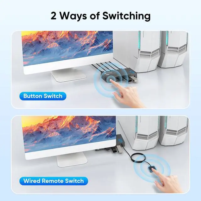 The 4K HDMI KVM Switch features two switching options: an On-KVM Switch Button and a Wired Remote Switch. The Wired Remote Switch allows you to place the KVM switch in a hidden or distant location, keeping your desk tidy. Simply place the Wired Remote Switch within easy reach on your desk for quick access. With a press, you can switch between computers seamlessly, enhancing productivity and reducing clutter.