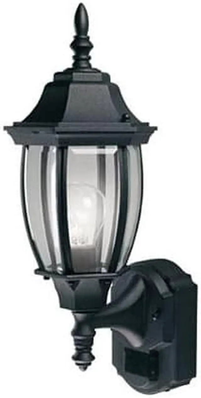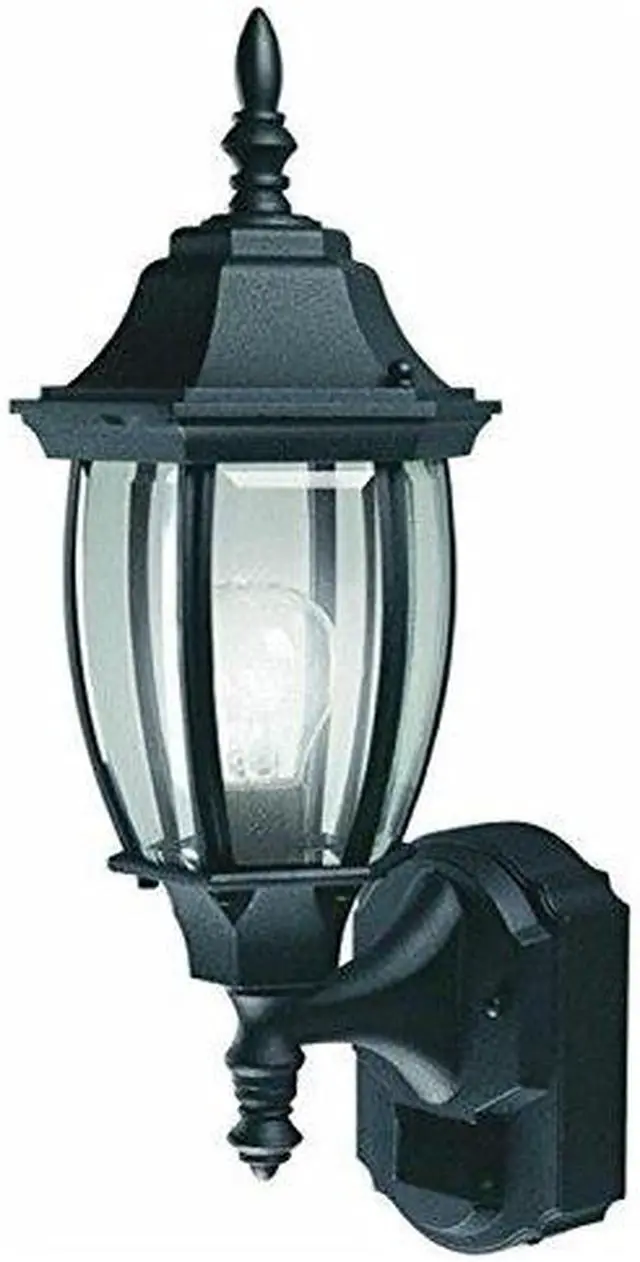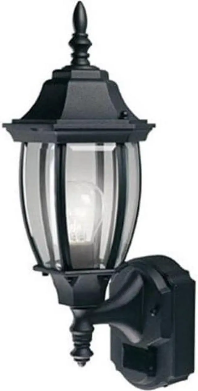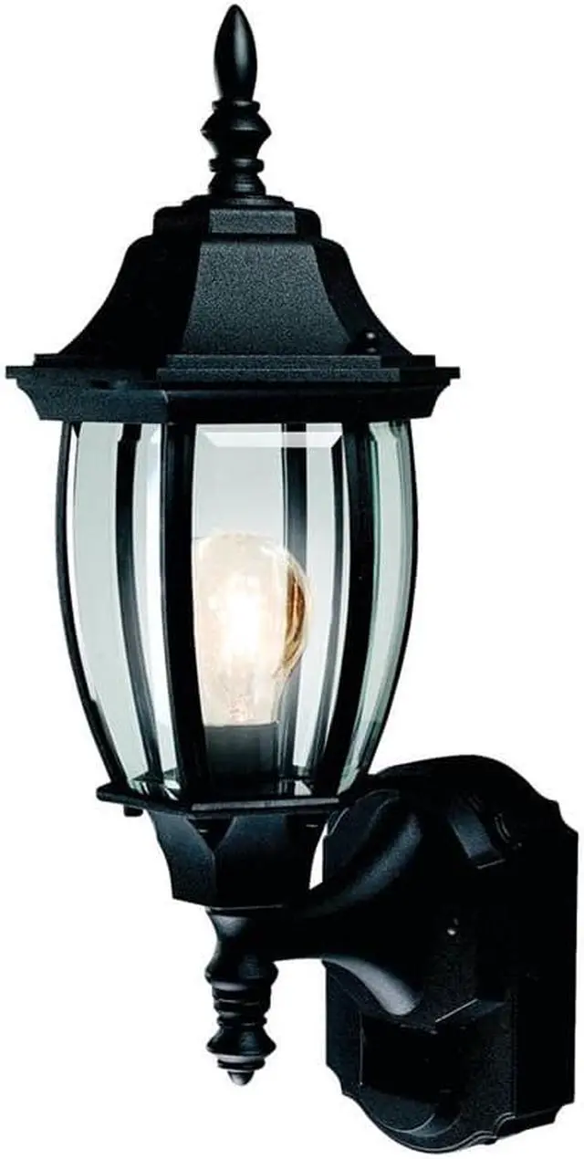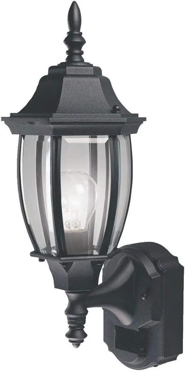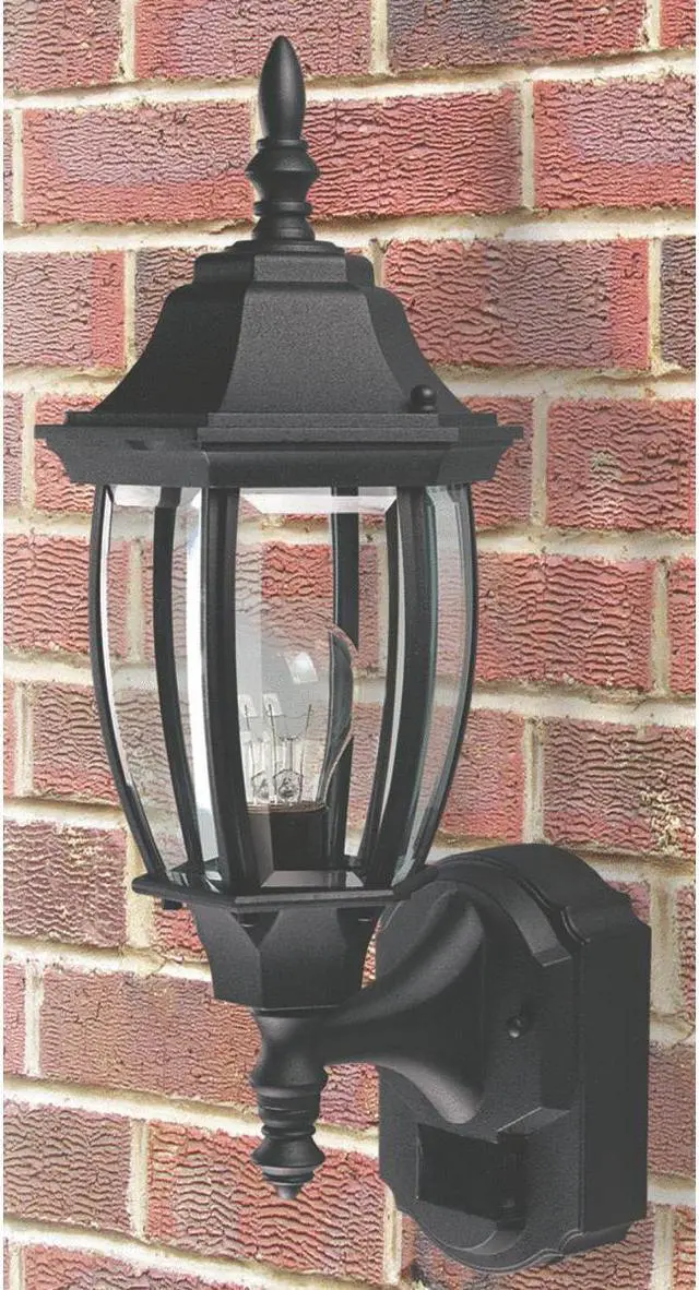 Coach style wall lantern with solid brass housing has selectable light timer that allows user to select an On setting for 1, 5, or 10 minutes before automatically shutting off lights after motion has stopped. Automatic photocell deactivates unit in daylight and Pulse Count technology reduces false sensing from wind and rain. Manual override will turn light Off or On at your convenience with existing indoor wall switch and allows light to stay On continuously all night when needed. Hidden 180 degree motion sensor and will detect motion up to 30 Ft. Uses (1) 100W bulb, not included.
