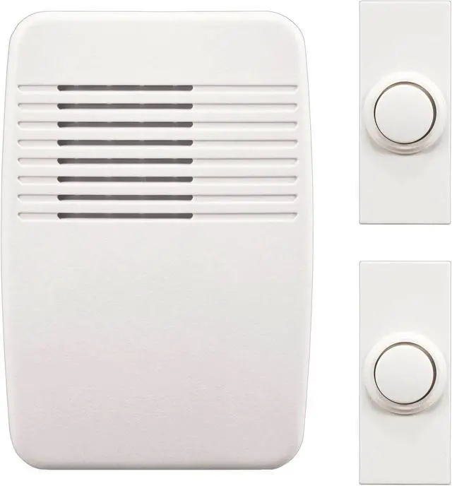 Wireless doorbell kit white cover. Chime plugs into any standard wall socket. 75 decibel maximum. UL/cUL FCC and IC Certified.nullnull