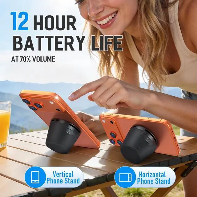 Portable & Mini: Boasting a lightweight (Weight: 3.1 oz) build and included carrying strap, this mini speakerroughly the same size as a tennis ball (Dimensions: 2.4 x 2.4 x 1.9 in)is easy to fit into womens cosmetic bags and mens crossbody bags. It's right there for you whether its hung in the bathroom, taken camping, brought hiking, carried to the beach, kept by the pool, or taken along for a bike ride. This portable Bluetooth speaker also attaches magnetically to your phone, serving as a phone stand that supports both landscape and portrait viewing.