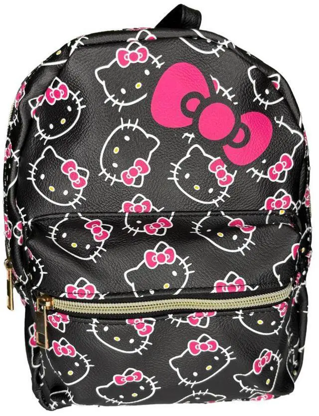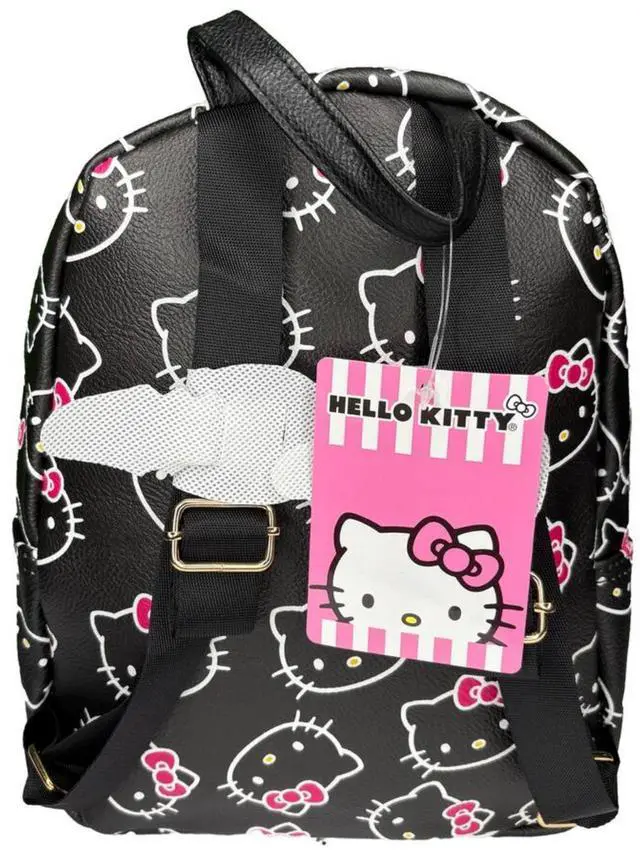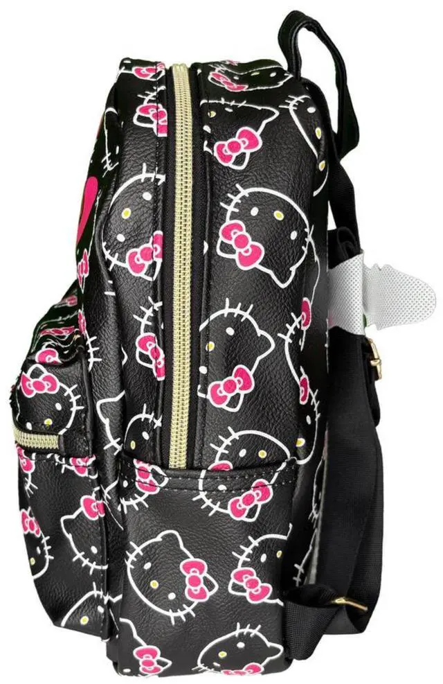 This Hello Kitty mini PU backpack features an allover black Hello Kitty head print with a cute pink bow accent for playful style. Compact and lightweight, it offers just enough room for small essentials while showcasing fun Sanrio charm. A zippered compartment keeps belongings secure, and adjustable straps support comfortable wear. The PU material gives it a stylish finish suitable for school or outings. A perfect accessory for young Hello Kitty fans.