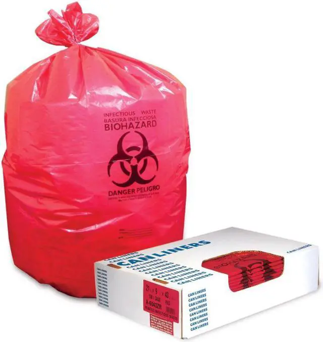 Biohazard printing is easily identifiable on these bright can liners. Made from high-quality, linear, low-density resin to ensure exceptional performance. Individually folded bags are designed for easy dispensing. Can liners' bright coloring ensures that the bags are easily recognizable from a distance, making the hazard message loud and clear. Global Product Type - Bags-Biohazard & Healthcare Can Liners Application - Can Liner Capacity Range (Volume) [Max] - 10 gal Capacity Range (Volume) [Min] - 8 gal Thickness - 1.3 mil Grade - Healthcare Material (s) - Polyethylene Width - 24 Height - 23 Color (s) - Red Pre-Consumer Recycled Content Percent - 0% Post-Consumer Recycled Content Percent - 0% Total Recycled Content Percent - 0%