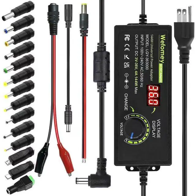 1x144W Universal Power Supply Adapter; 14x DC Tips; 1x Reverse Polarity Converter Cable, 1x Alligator Clip Test Lead, 1x Male DC Power Pigtail Cable
