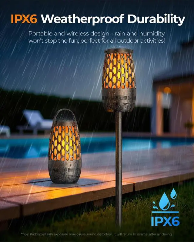 | Recommended Uses For Product | BBQs and Grilling Use the stable lighting and clear sound while hosting a BBQ in the garden or on the porch, creating the perfect environment for cooking and dining., Backyard Parties Set the mood with immersive sound and LED flame lights for a perfect backyard gathering with friends and family., Camping Trips Enhance your outdoor experience by bringing both music and ambiance to your campsite with this portable speaker and light combo., Hiking and Outdoor Adventures Take it along for a hike or outdoor exploration, as it provides music, light, and weather resistance for any condition., Holiday or Special Occasions Add a festive touch to holiday gatherings, birthdays, or celebrations with vibrant lighting and music., Outdoor Movie Nights Sync the speaker with multiple units for a surround sound experience while enjoying movies under the stars., Outdoor Workouts Bring the speaker outdoors for an energizing workout session with your favorite playlist, enjoying both music and light in any weather., Patio Dinners Use the flickering flame light to create a cozy, intimate atmosphere for a peaceful dinner or evening relaxation on your patio., Poolside Gatherings Place the speaker by the pool for waterproof music and vibrant lighting, perfect for summer pool parties., Relaxing Evenings Set the speaker to breathing light mode and enjoy soothing music as you unwind after a long day in the comfort of your home or garden., Tailgating Events Bring it to your next tailgate party for high-quality sound and customizable lighting that enhances the event atmosphere. |
