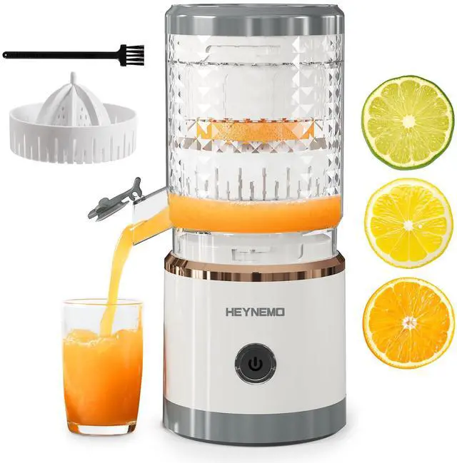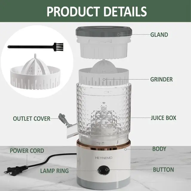 Stylish and Classic Design:This juicer features a modern gray and white color scheme, enhanced by gold trim for a sleek, contemporary look. The design fits seamlessly into any kitchen, whether you're using it as a citrus juicer electric or an orange juice squeezer. Its minimalistic aesthetic not only adds style to your kitchen but also provides durable, functional juicing for everyday needs. Its perfect for those looking for a stylish juicer that complements their kitchen decor.