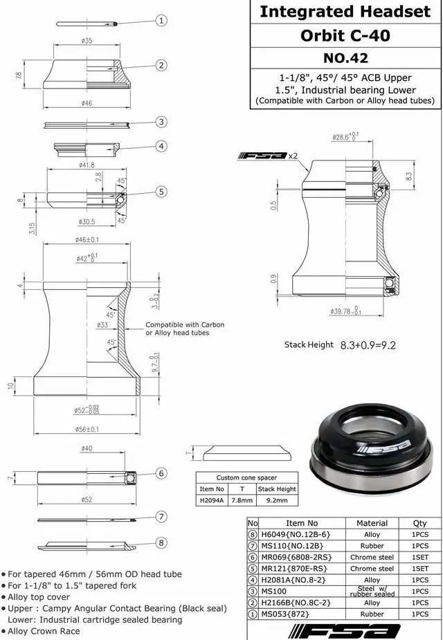 - Upper Headtube I.D. 42mm
