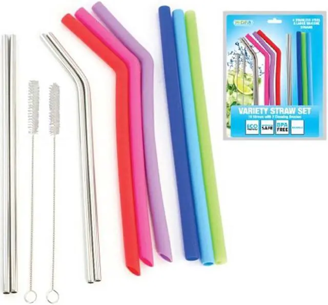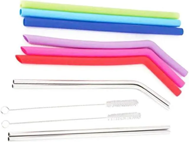 Set contains: 6- 9.75" Long Flexible Silicone Straws, 4 - 9.5" Long Stainless Steel Straws and Two Cleaning Brushes.