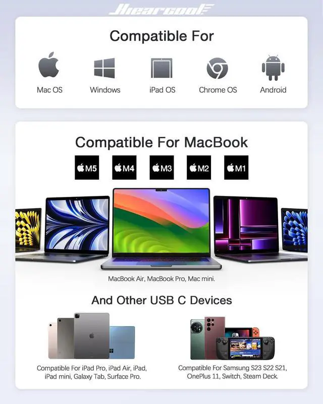 | Compatible Devices | Macbook M5/M4/M3/M2/M1,Mac Mini M4/M3/M2/M1,iPad Air/Pro/Mini,iMac,Dell XPS 17/15/13,Latitude 5420/7420/7490,HP Chromebook Pro X360 Fortis,Lenovo Yoga 7i 2-in-1 and other Type C Laptops,Steam Deck,Type C Smartphones,iPhone 17 Pro Max,iPhone 17 Pro,iPhone 17 Air,iPhone 17,iPhone 16 Pro Max,iPhone 16 Pro,iPhone 16,iPhone 16E,iPhone 16 Plus,iPhone 15 Pro Max,iPhone 15 Pro,iPhone 15,iPhone 15 Plus |