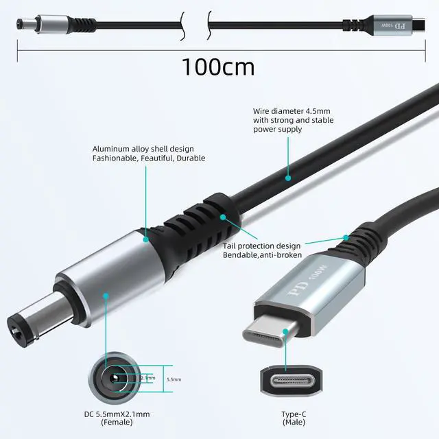 Specifications: USB C to DC 5.5MM x 2.1mm for laptop, Compatible with Toshiba and other (5521) laptop. USB C to DC 20VBuilt-in a PD smart chip,it can convert the PD Charger into DC 20V. It supports 20V 5A Max. ConvenientThis PD USB-C to DC Power Convertor cable allows you to get rid of heavy UPS 110V.You can carry it in pocket lightly in your office/studio/travel. How to useIf your equipment power Jack is DC 5.5mm x 2.1mm with 20V Neededyou can use this cable with a PD Charger or PD Power bank to power your equipment. PD Device RequirementThis Cable is just a conversion device,you need to provide correct PD power Adapter or PD Power Bank which support 20V output.Please note the Type-C charger power must be over than the output end power.The Power Bank should support 20V output. Advanced technology and aluminum alloy casing manufacturing make this cable reliable and durable. Made of high-quality wire, ensuring an excellent experience for your device.