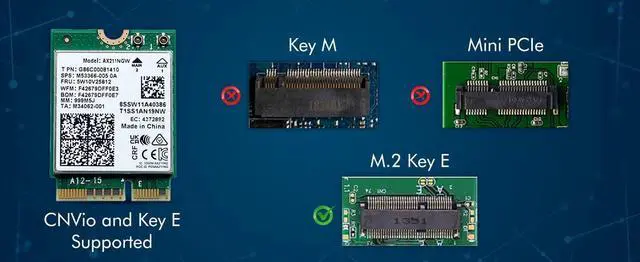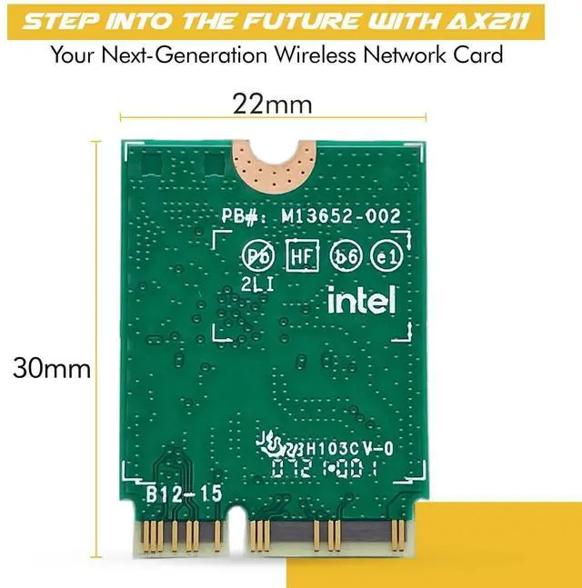 The Wi-Fi 6E AX211 module supports legacy Wi-Fi 4, 5, 6, and Wi-Fi 6E, and is designed to support Wi-Fi 6 R2 features. By implementing Wi-Fi 6E technology supporting the 6GHz band that includes 1200MHz of contiguous spectrum (>2x compared to 5GHz) with more Gigabit Wi-Fi options and exclusivity to Wi-Fi 6 products, the Wi-Fi 6E AX211 module maximizes Wi-Fi 6 and Gigabit Wi-Fi benefits enabling greater network flexibility, faster downloads, sharing and backups as well as reduced latency and improved reliability. When using Wi-Fi 6 technology with 1024QAM and 160MHz channels, the Wi-Fi 6E AX211 module can deliver nearly 3x higher peak data rates (up to 2.4Gbps) and up to 4x capacity improvement in dense or congested environments comparing to Wi-Fi 5. On top of existing features, built-in Bluetooth 5.3 compatibility includes Isochronous Channel feature which lays the foundation for the implementation of next generation of Bluetooth Audio KEY_TAB Low Energy Audio. Bluetooth 5.3 Core specification also provides the capability to change the transmit power of the devices (local and peer) to improve link quality while optimizing power consumption. This M.2 2230 module enable system configuration and platform usage flexibility with the use of a standard Key E socket for attaching the module. Don't forget to download your drivers before installing your new card! (Some systems will do this automatically). Drivers are available on the public domain under "AX211 Drivers". For install in a desktop PC, a conversion kit (sold separately) is likely required. Please check with your system manufacturer. Specification: Model: AX211NGW Interface: M.2 CNVi Antenna: 2x2 TX/RX Streams: 2x2 Wi-Fi CERTIFIED: Wi-Fi 6E Compliance: FIPS, FISMA Bluetooth Version: 5.3 Integrated Bluetooth: Yes Board Form Facto: M.2 2230 Supported Operating Systems: Windows 11 64-bit, Windows 10, 64-bit MU-MIMO: Yes Orthogonal Frequency-Division Multiple Access (OFDMA):Yes