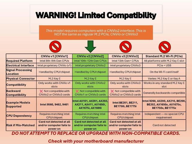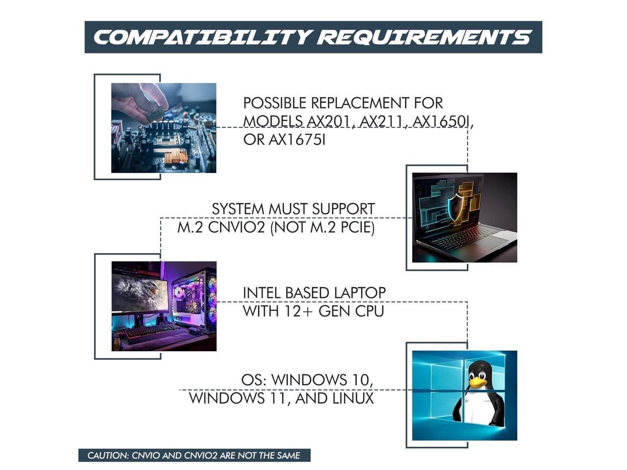 - WARNING!! ONLY compatible with 12th+ Gen Intel CPU-based systems. REQUIRES: Linux or Windows 10/11 64-bit systems, with CNVio2 interface PC must have available M2 Slot with Key E. Suitable to replace AX201 or AX211 ONLY--AS LONG AS YOUR SYSTEM MEETS ALL OTHER REQUIREMENTS.
