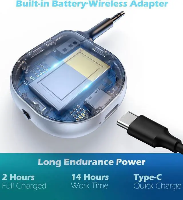 LONG BATTERY LIFE: Bluetooth adapter for airplane built-in battery provides up to 14 hours of music streaming. Bluetooth transmitter takes only 2 hours to fully charge the device using a Type-C fast charging cable (Included in the package).
