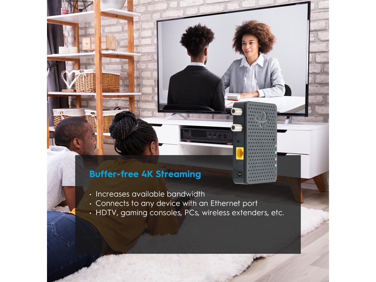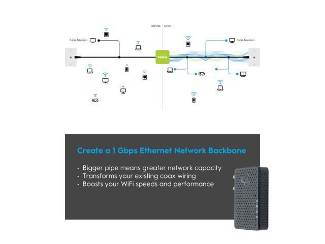 - CONVERT COAX WIRING INTO GIGABIT ETHERNET to create a bigger network pipe to connect any Ethernet device, such as a gaming system, streaming 4K HDTV, computer, WiFi router or extender, to increase bandwidth and coverage.