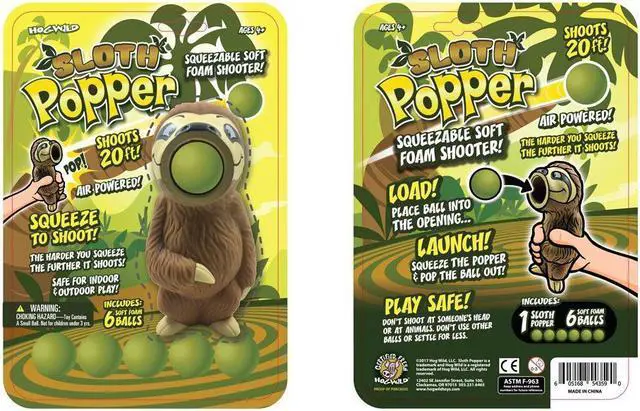 Don't sleep on the Sloth Popper! Just load one of the six soft foam balls into the opening and squeeze its belly to shoot - up to 20 feet! The harder you squeeze, the further this air powered sloth shoots, both indoors and outdoors. Play safe - don't shoot at someone's head or at animals. Don't use other balls or settle for less.