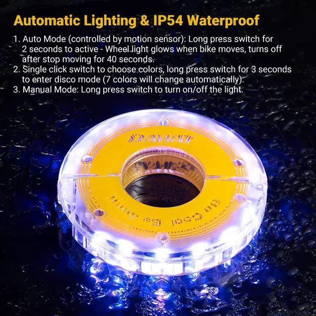 • Smart Auto/Manual Modes & All-Speed Safety: Get intelligent control with motion-activated Auto Modejust hold the button 2 seconds. bicycle tire lights glow as you ride and turn off 40s after stopping. Tap to cycle through 7 colors or hold 3sec for vibrant disco mode. Lightweight and secure, they work at any speed without affecting balance, boosting your visibility and safety day or nightso you stand out from every angle
