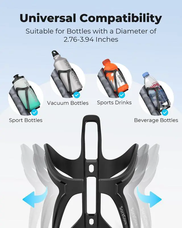 Lightweight and Compatible:The new bike water bottle holder is a lightweight design, weighing only 1.2oz. It is compatible with bottles with a diameter of 2.76-3.94 inches, including sports bottles, vacuum bottles, sports drinks, mineral water bottles, etc. It is a great bicycle accessory.