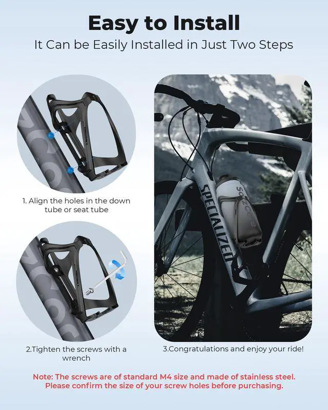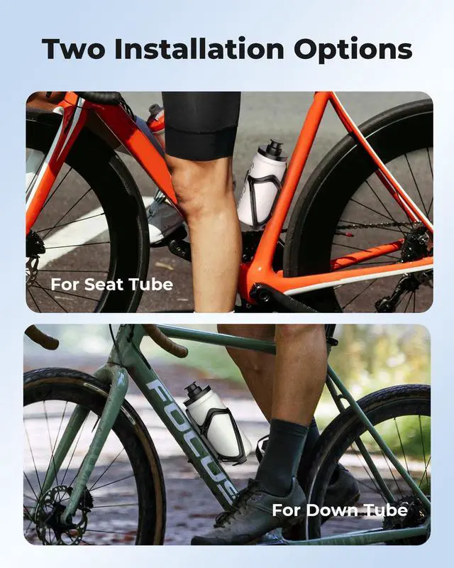 Easy Installation: The bicycle water bottle cage is suitable for bicycles with pre-drilled screw holes (2.36-2.76 inches screw hole spacing). The installation tool is already included. You can install it and use it in two simple steps. Note: If you receive your goods and are missing bicycle bottle accessories, please notify us and we will follow up closely.