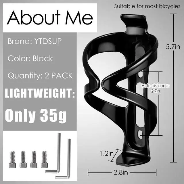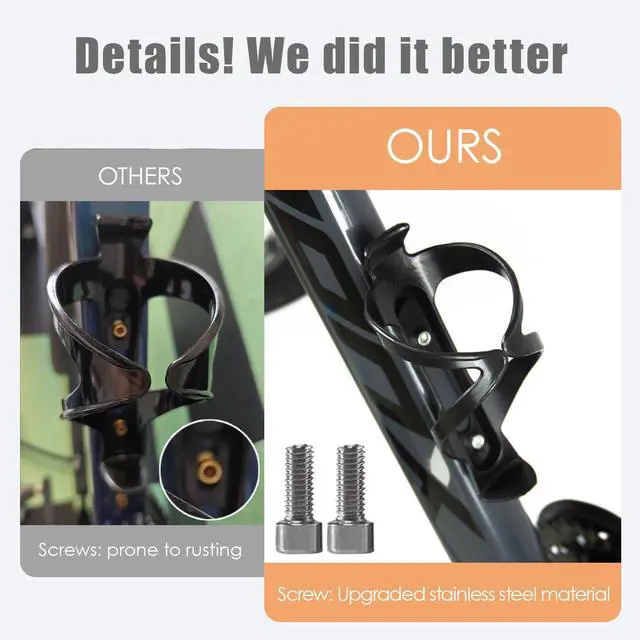 Quick Installation & Universal FitThis bike water bottle cage features a quick and easy installation using standard frame mounts and included stainless steel screws. It is perfectly suited as a gravel bike accessory, e-bike bottle holder, or childrens bicycle bottle cage.