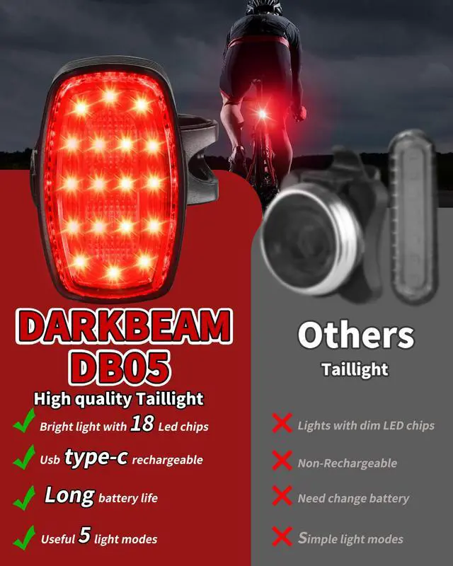 DARKBEAM Bike Light Kit, USB Rechargeable, Super Bright Bicycle Lights, 6+5 Mode Cycling Lights, 2 LED Headlight and 18-LED Taillight
