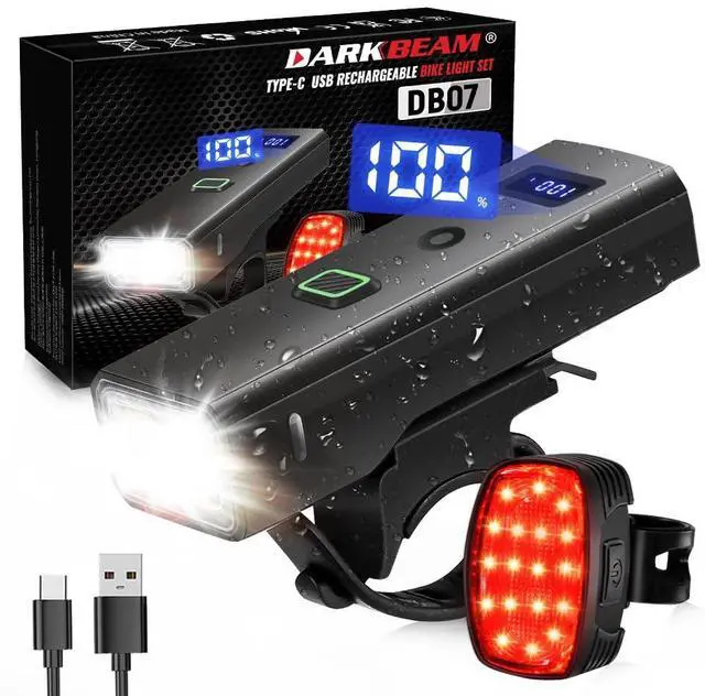 DARKBEAM Bike Light Set 4+5 Mode - Powerful Bicycle Front Headlight and 18-LED Red Taillight - USB Rechargeable, Waterproof Mountain Bike Cyclin Light