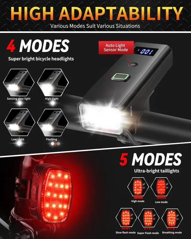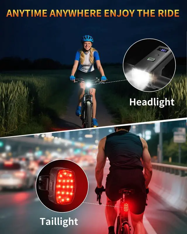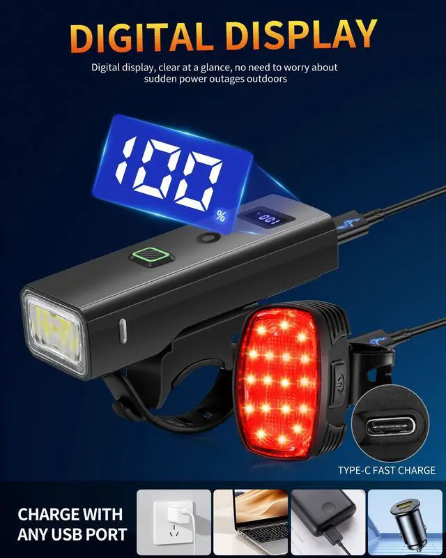 This new model of ultra-bright bike lights comes with a smart, waterproof headlight featuring an ultra-wide-angle lighting floodlight and an automatic light sensor. It is USB-C rechargeable and comes with a high-visibility rear taillight. Whether you're commuting or exploring, this set has everything you need for a brighter, smarter ride.