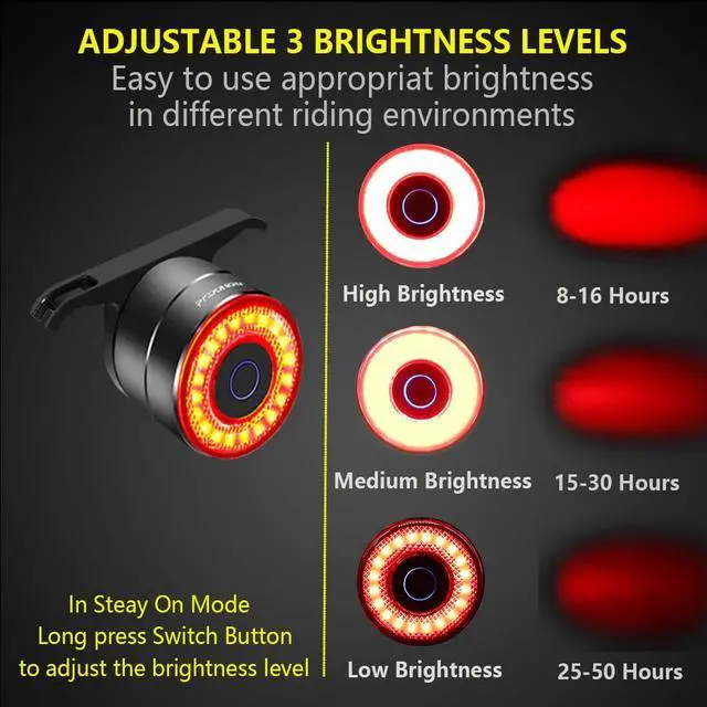 - The bike tail light has 3 levels of brightness and the brightness of the bike rear light can be adjusted according to your needs
