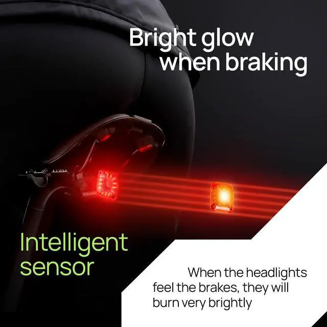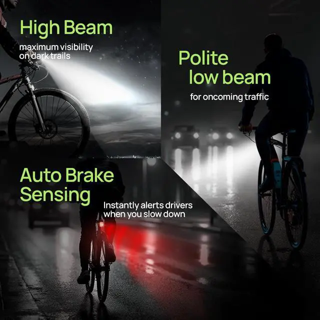 1 INTELLIGENT SAFETY SYSTEM: Ride with confidence! This bike light set thinks for you, featuring a smart tail light that automatically senses when you brake and intensifies its brightness to alert drivers, just like a car. The front light offers both a powerful high beam for dark trails and a polite, non-blinding low beam for when you're not alone, ensuring maximum safety for everyone on the road.