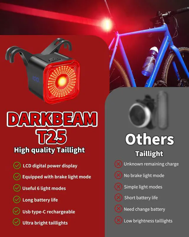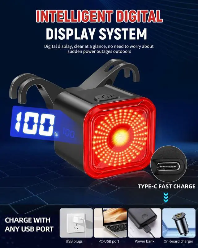 DARKBEAM USB-C Rechargeable Bike Tail Light, IP55 Waterproof Rear Bike Light with LED Display Screen for Night Riding, 6 Modes Bicycle Taillight
