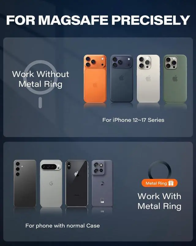 Works with All Phones:for MagSafe & All Phones: Features 17*N54 strong magnets for perfect alignment with iPhone 12-17 series (for MagSafe models). For other phones, the included magnetic ring ensures instant, secure attachment.