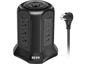 Power Strip Tower Surge Protector BEVA 10ft Flat Plug Desktop Charging Station 9 AC Outlets 4 USB Ports, 900 Joules, Long Extension Cord for Home Office Appliances Smartphones Computer Tablets(Black)
