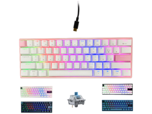 ONE-UP Portable 60% Mechanical Gaming Keyboard LED Backlit Compact 61 Keys Mini Wired Office Keyboard with Blue Switch PBT Keycaps for Windows Laptop PC Mac.White/Pink