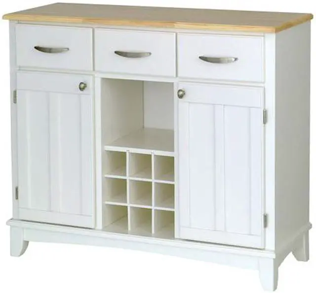 | description | Three utility drawers on metal drawer slides, two cabinets, each having an adjustable shelf plus an open storage area featuring a wine bottle storage bin Construction consists of solid wood and veneers including a clear coat finish to help protect against wear and tear from normal use Equipped with adjustable floor levelers |